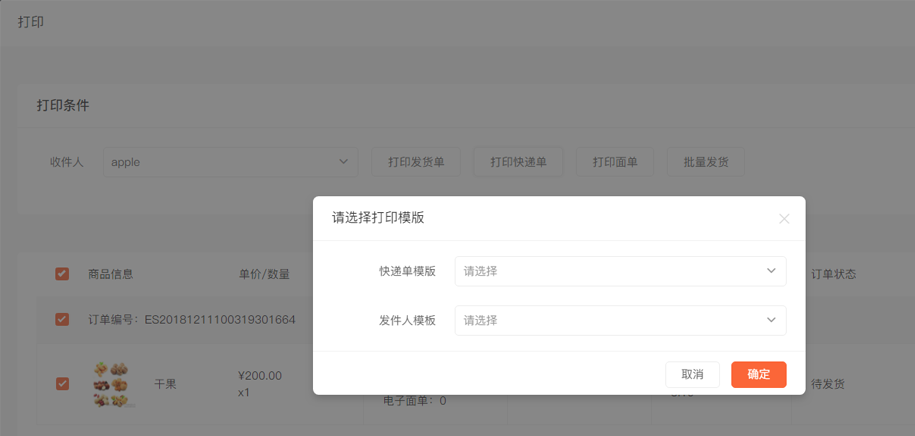 打印订单的时候,可以用批量打印,也可以单个订单打印,然后在选择是否需要打印快递单、发货单等信息,参见下图: