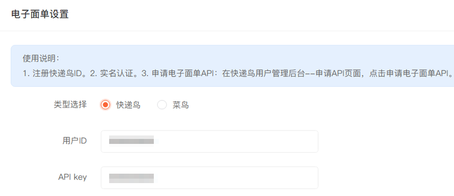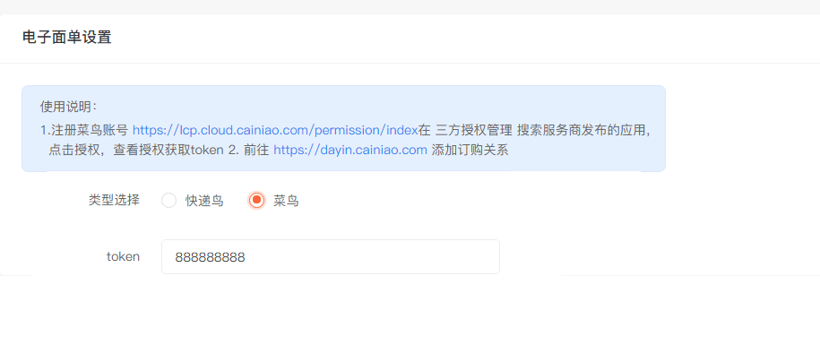 电子面单设置包含了快递鸟和菜鸟裹裹2种类型,参见下图: