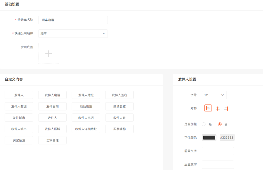选择商城常用的快递方式,然后将快递单上传上底图(底图是作为打印内容的位置参考),在选择需要打印的内容信息,参见下图: