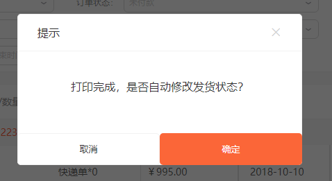 打印完毕后,系统会弹出选择是否修改订单状态的提示框,如果选择“确定”则订单状态会立即更改,“取消”则不修改订单的状态,参见下图: