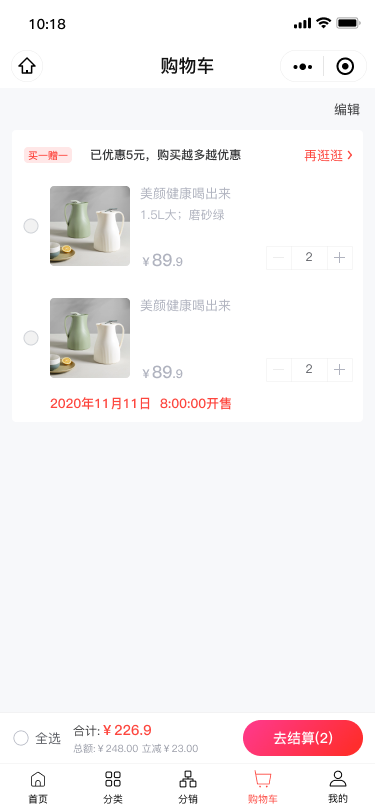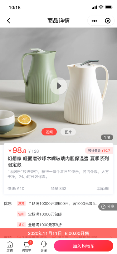 如图,商品详情页和购物车中,均有开售时间提示。