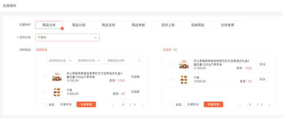 选择批量操作中的选项和相应目标进行商品的选择。可批量参加也可全部参加。