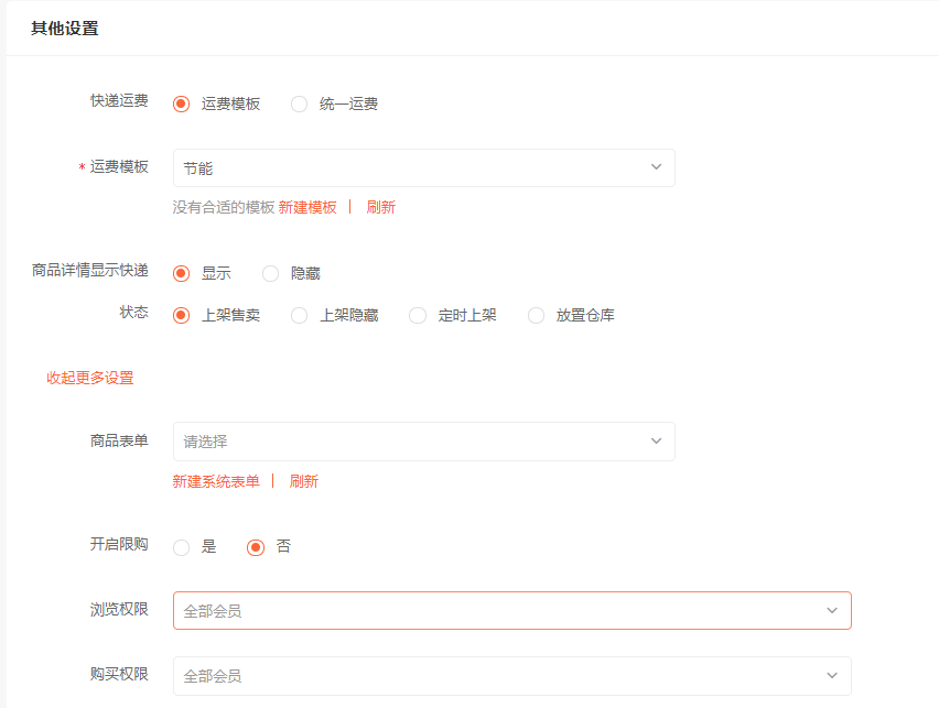 5、更多设置中可以选择商品表单,商品表单在应用的系统表单中创建