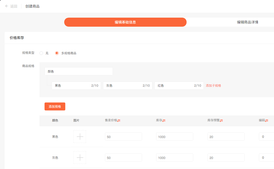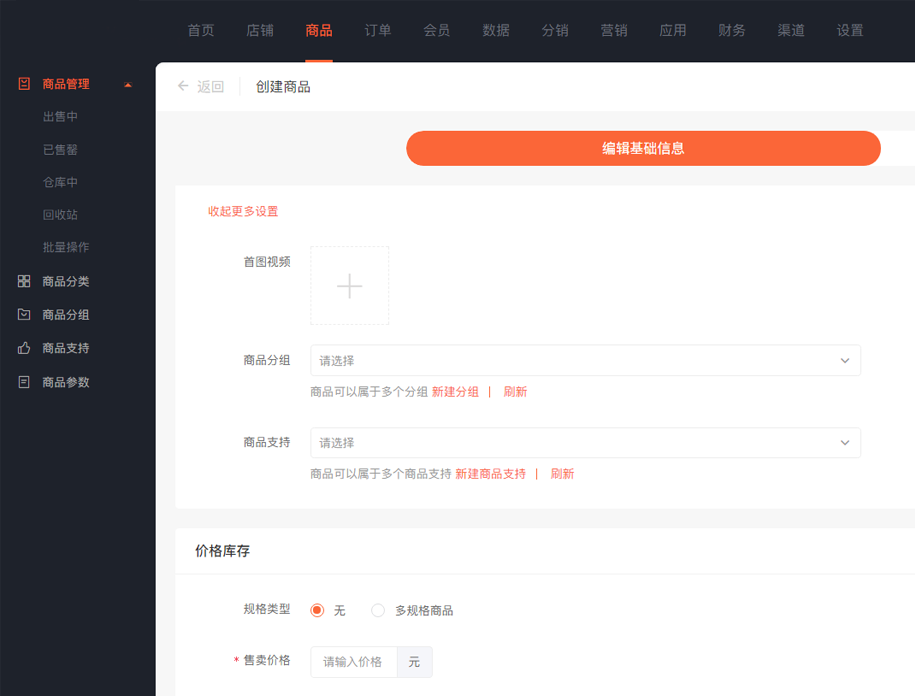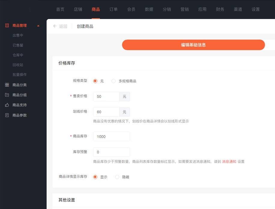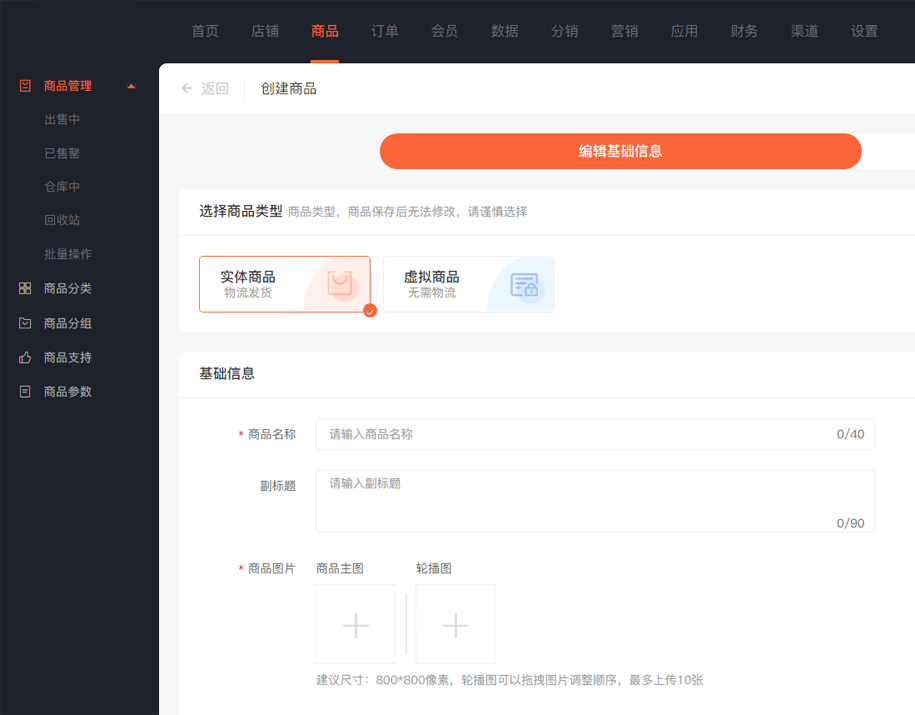 第一步:选择商品类型,设置商品名称、副标题、商品图片等基础信息