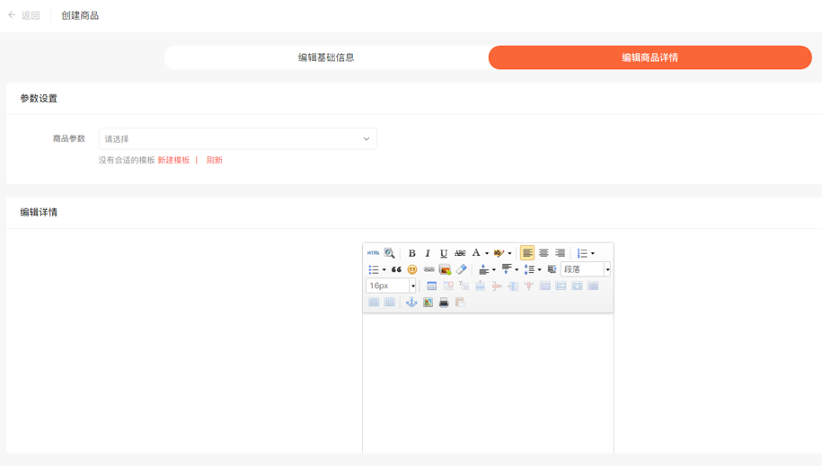 商品的参数分为:模板和图片两种,参数的图片直接上传,就可以显示在商品详情页面中。温馨提示:商品详情是必须要填写的。
