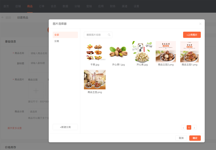 2、上传商品图片的时候,在图片选择器中可以分类管理图片,可以直接点击左侧的分类,选择图片即可;光标指向图片时,可直观查看图片的尺寸。