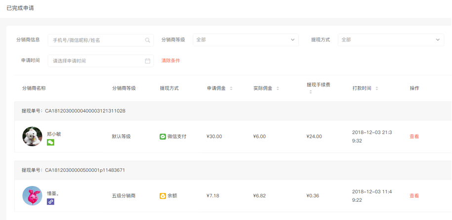 分销商在手机端申请提现,商家审核通过之后,给分销商佣金打款