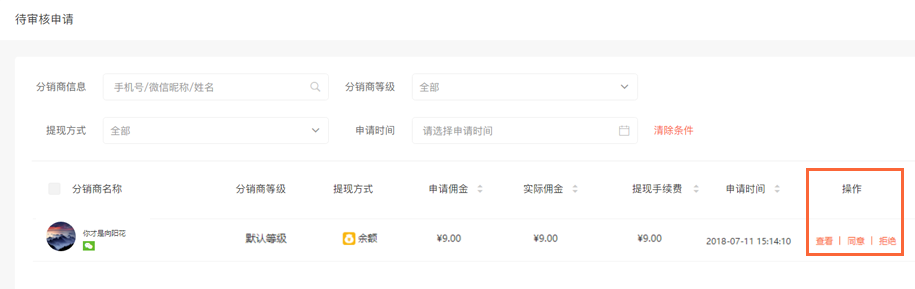 业务端管理员对分销商提出的提现申请进行审核,分销—提现管理——待审核,点击查看,可以看到订单信息,根据实际情况,选择同意或者拒绝,然后提交审核,提现申请就会到待打款中