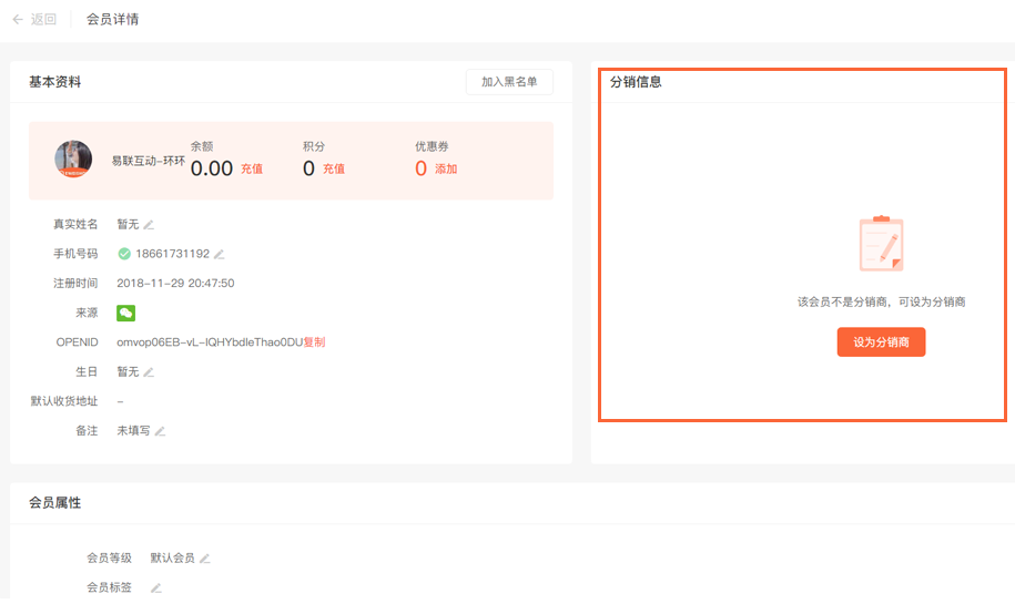 业务端管理员与会员线下达成协议之后,直接在业务端后台手动设置该会员成为分销商,无需会员自己申请;业务端管理员点击会员—会员管理,找到该会员点击查看,分销信息—设为分销商