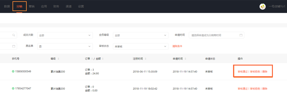 成为分销商条件选择申请,则业务端管理员需要点击分销—分销商管理—待审核,点击审核通过或者审核拒绝