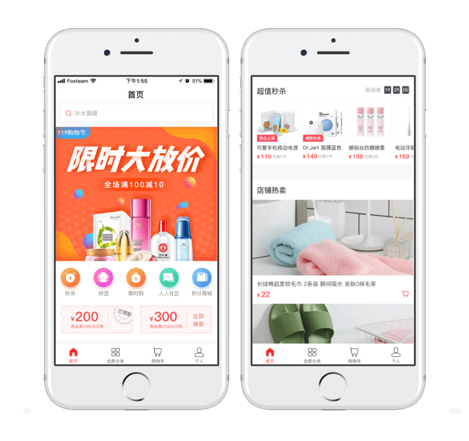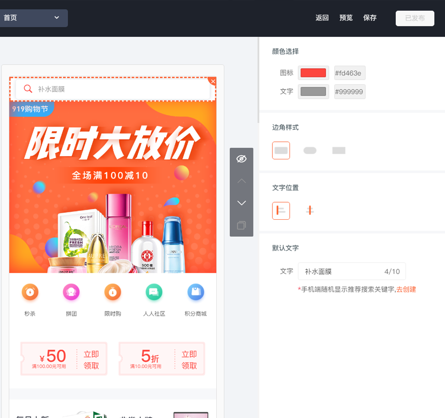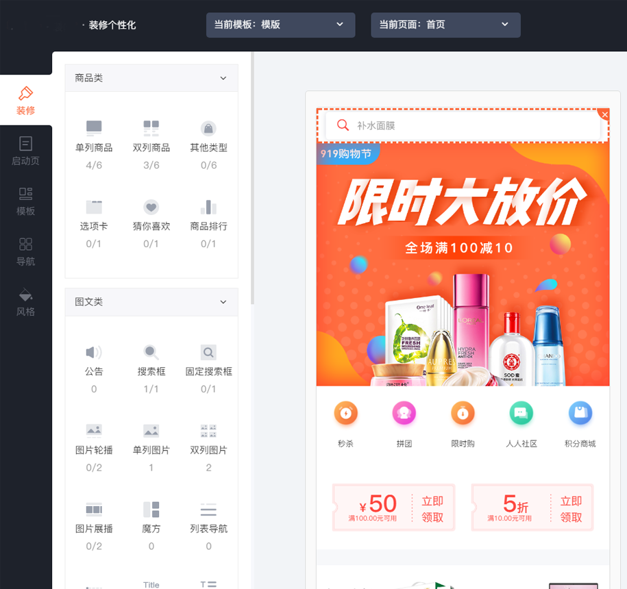 业务端管理员通过后台可以在官方模板中自定义设置首页显示元素,也可以通过模板购买处购买适合自己店铺风格的设计师模板,然后还可以在模板中添加适合店铺的其他元素。