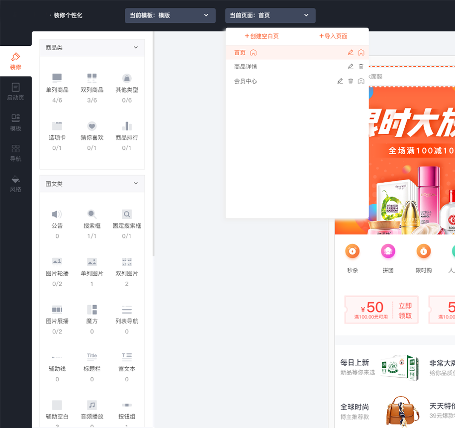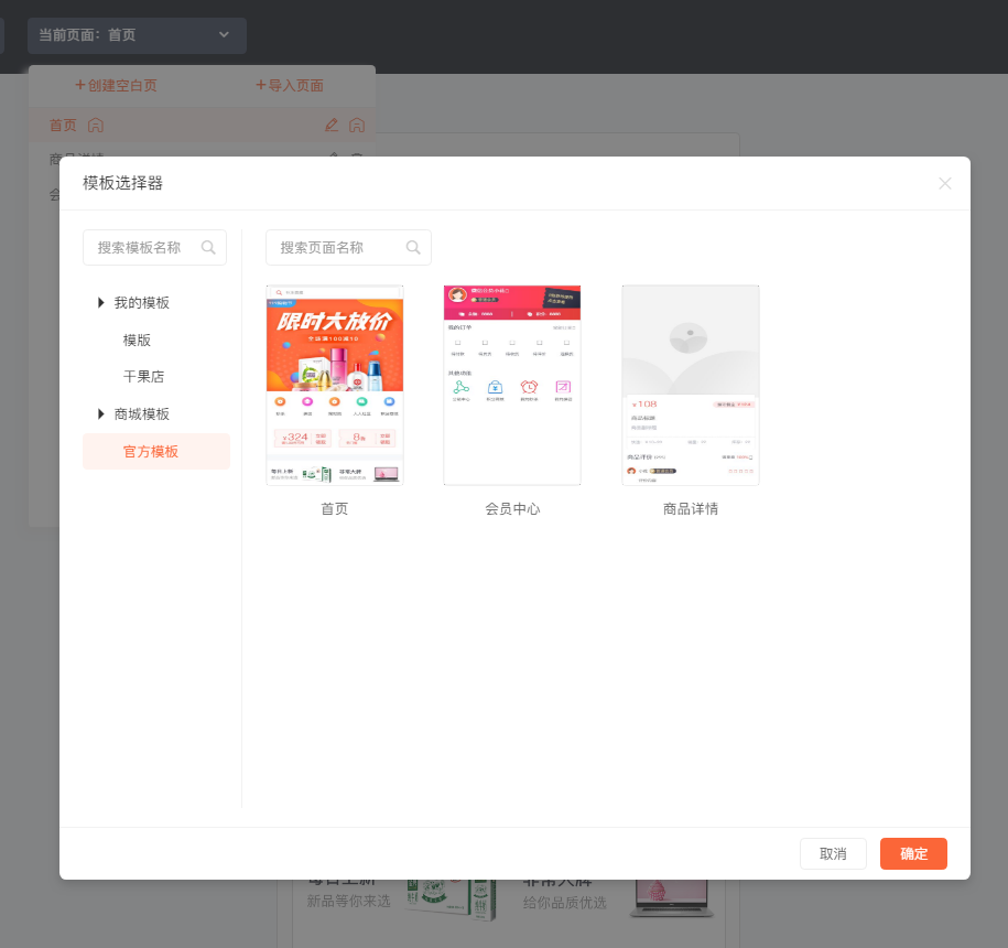选择好模板以后,开始创建页面,可以创建的页面有:商城首页、会员中心、商品详情页。