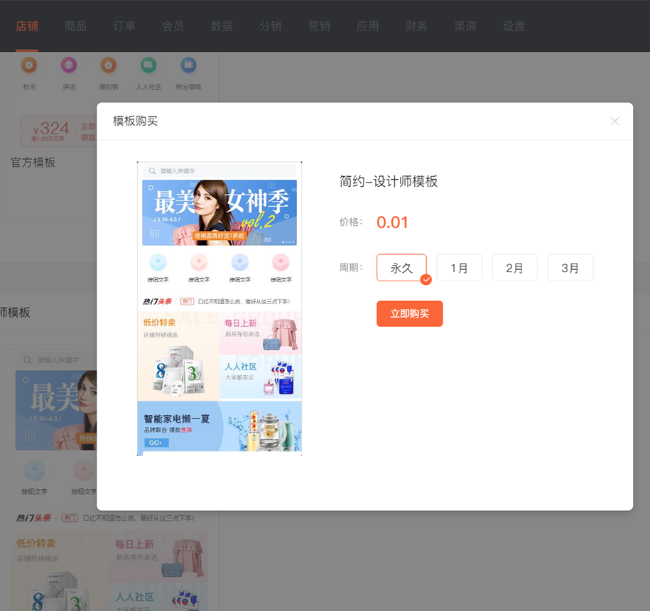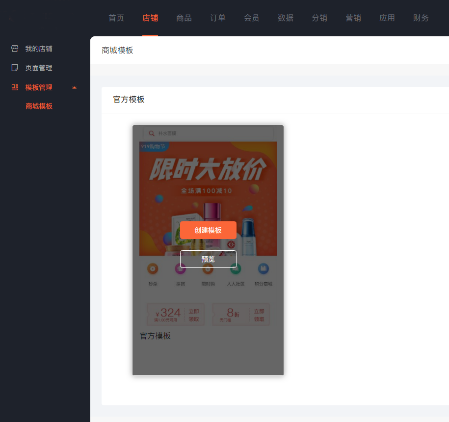 进入业务端点击店铺—模板管理,可以看到有官方模板和设计师模板两种选择