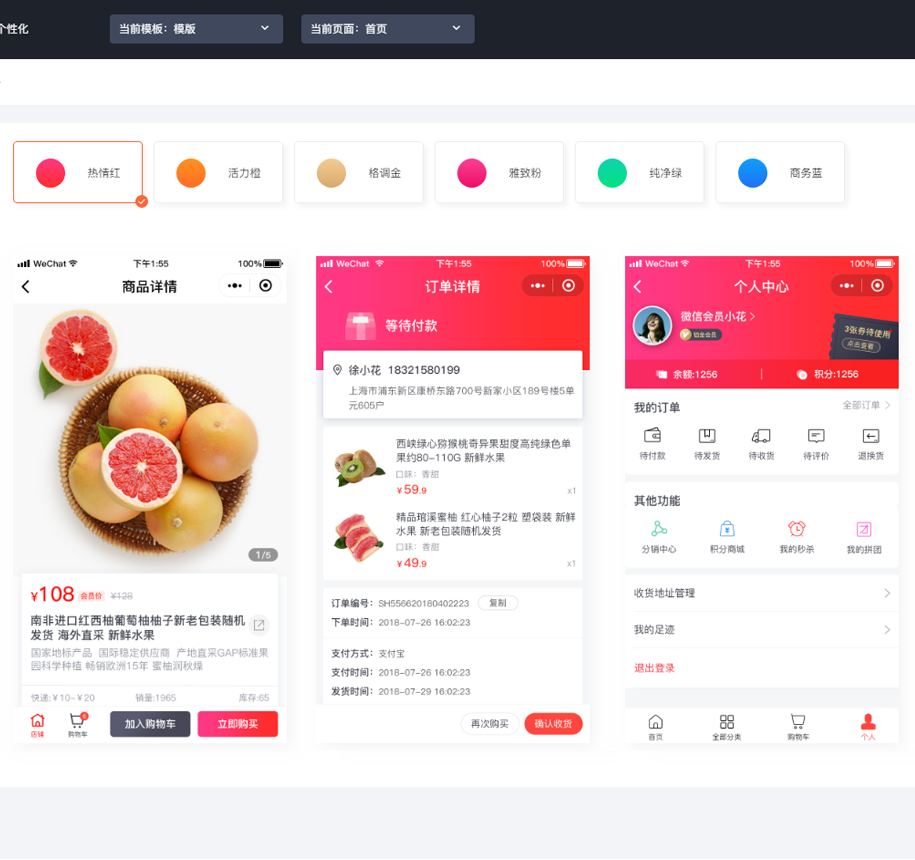 上方截图的模板设置,是商城的首页模板设置,商家如在创建会员中心和商品详情页,需要在创建页面处选择模板,具体流程如下: