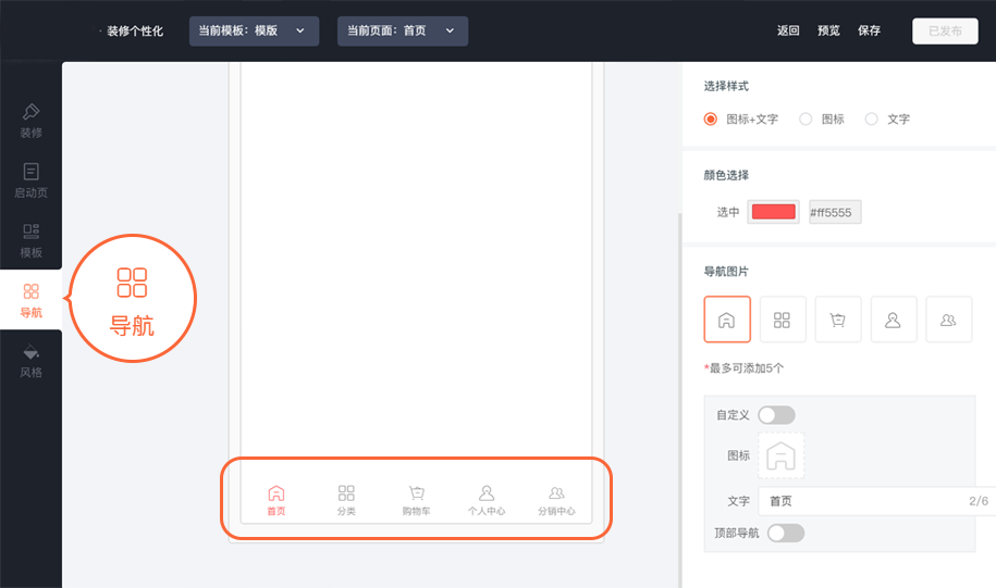 1、业务端商家可以选择系统提供的“图标+文字、文字、图标”三种样式进行设置;还可以去设置会员选中导航显示的颜色;导航图标的样式都可以去自定义选择显示