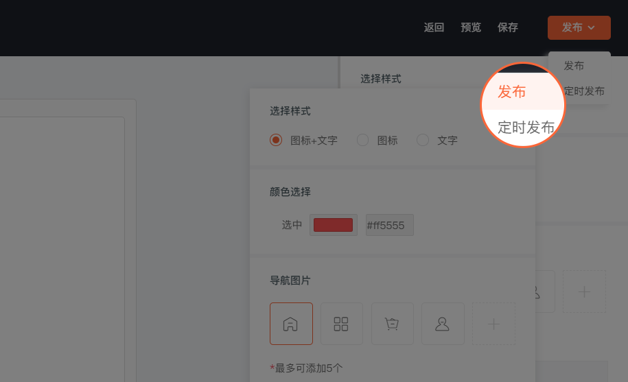 1、店铺装修页面模板的发布支持“发布和定时发布”两种方式