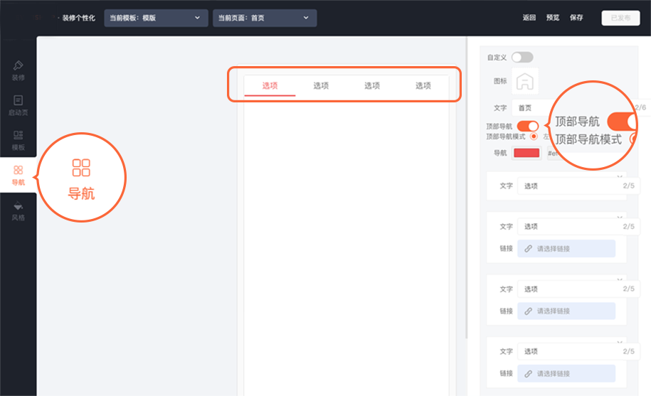 业务端商家在设置导航首页的时候,可以启用“顶部导航”的功能;这个功能是固定在首页顶部,有滑动和换行两种方式去显示,固定显示的导航的文字以及需要点击跳转的链接都是自定义去设置,见下图: