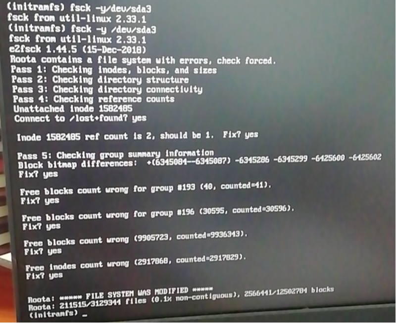 上图即显示自动修复了文件系统损坏的/dev/sda3分区。