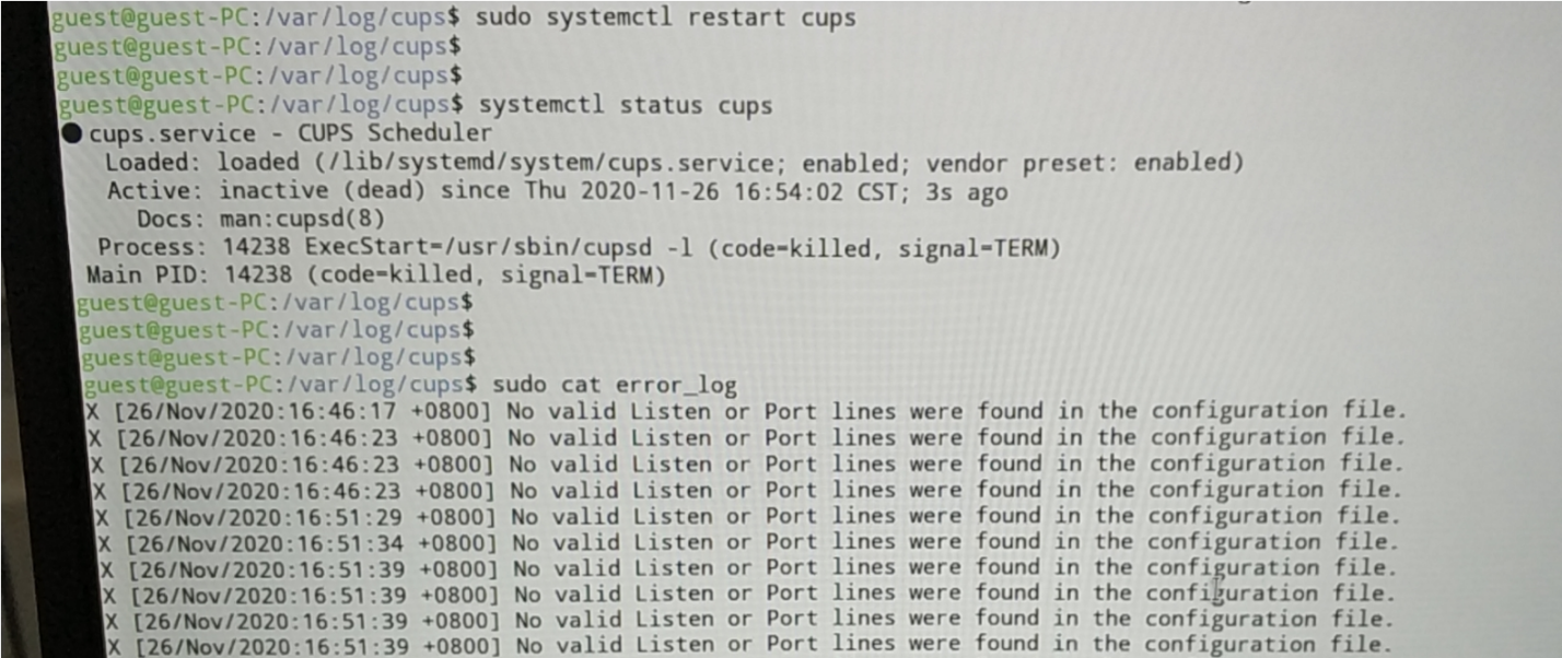 查看cups服务状态为dead,,查看cups的error日志报错(No valid Listen or Port lines were found in the configuration file.),如下: