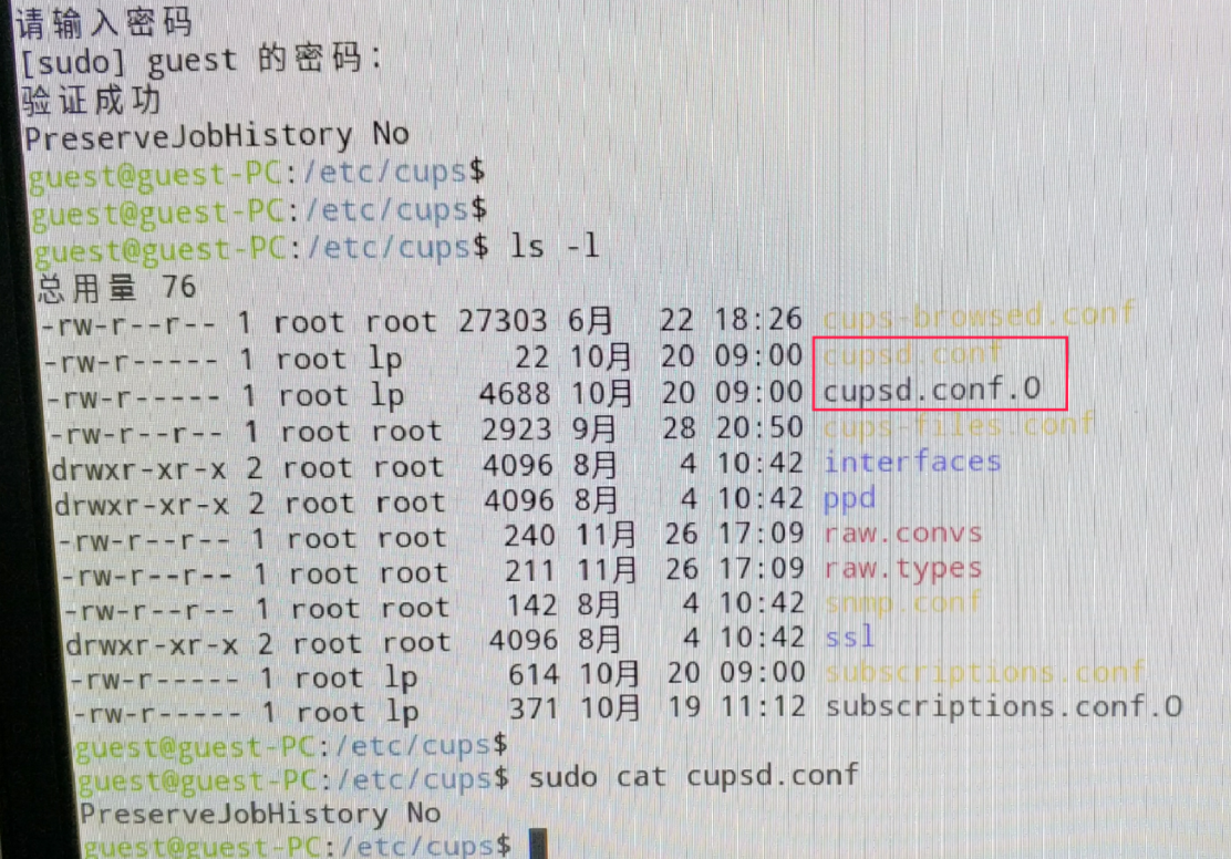 3)查看cups配置文件(/etc/cups/cupsd.conf)内容只有一行,在该目录下还有一个cupsd.conf.O的文件,直接将此文件内容覆盖到cupsd.conf这个配置文件里,即可正常启动cups服务,添加打印机打印成功。