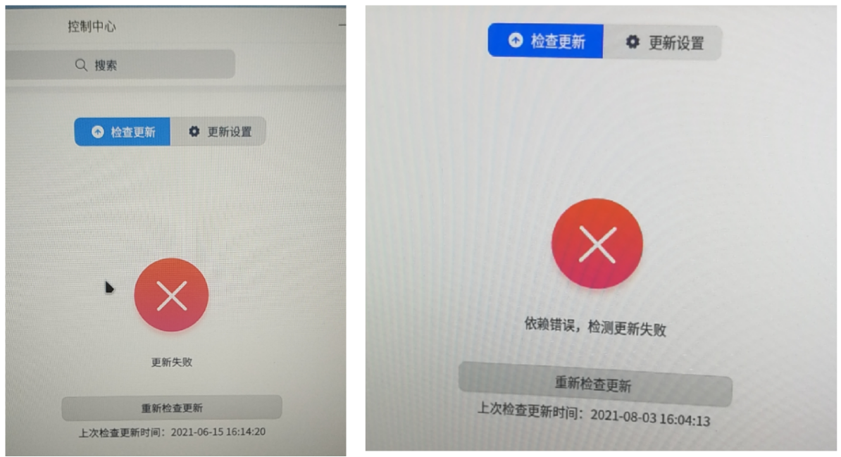 **1、问题描述:系统检查更新失败,或者系统更新的过程中失败,如下图:***