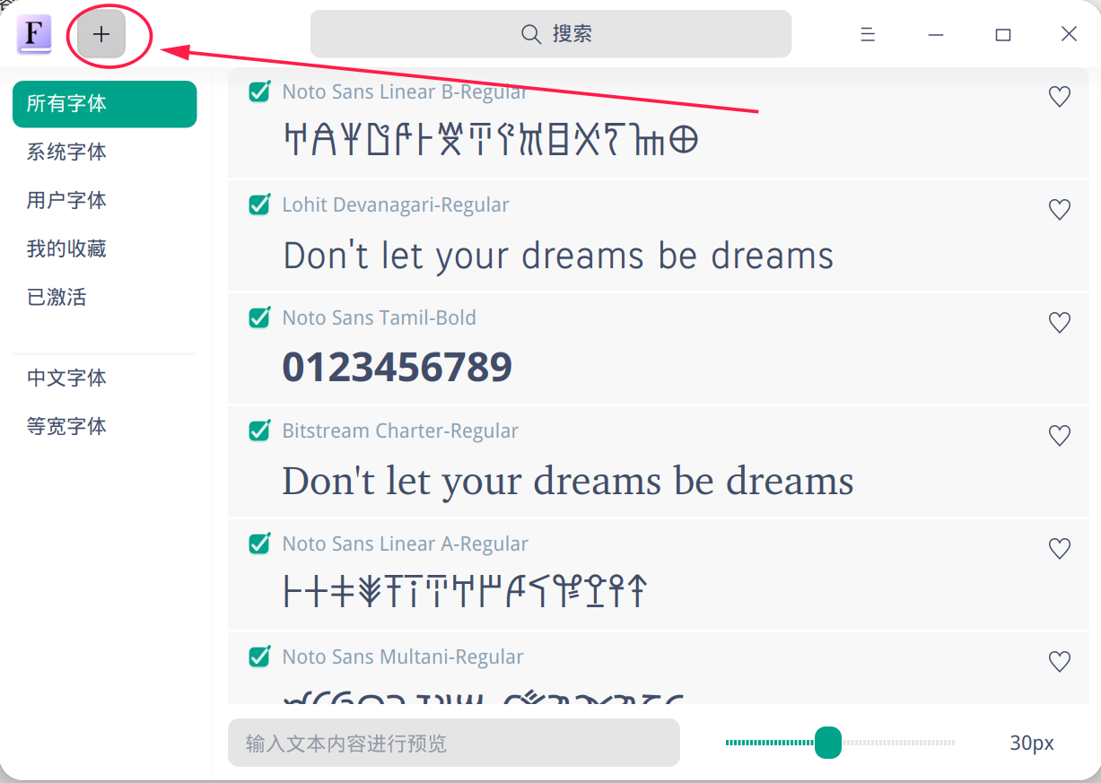 4)添加字体,选择字体管理器左上角的“+”号,进入U盘中的字体文件夹,用鼠标选择所需要的字体进行上传确认即可;或者直接把U盘中拷贝的字体选中后拖拽到字体管理器中即可。