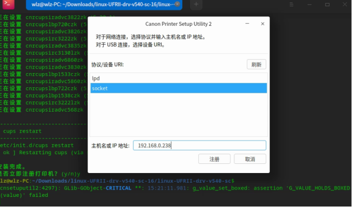 根据打印机的连接方式,选择不同的协议后选择打印机型号。 本例中该打印机为网络连接,选择socker协议,输入打印机IP地址,随后点击注册完成打印机的注册,点击关闭。