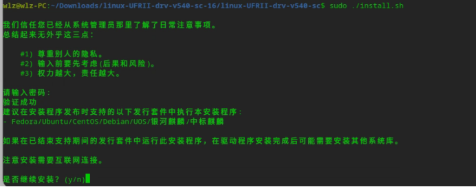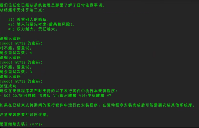 使用sudo ./install.sh执行该脚本,输入登录密码后,根据提示输入Y继续安装。
