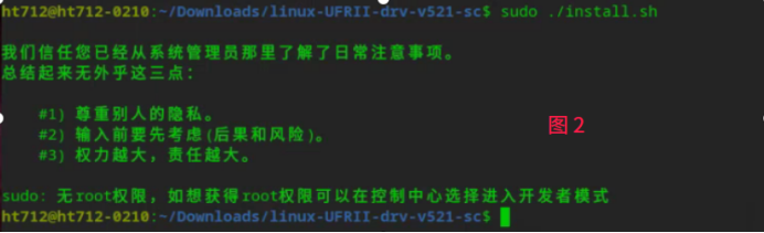 -----------------------------------------------------------------------------------------------PS:在该步骤中如若用 ./install.sh执行脚本,会如图1提示将用户更换为根用户,因该官方脚本要求必须用root去执行,所以需要使用sudo ./install.sh。若如图2提示无sudo权限,需要先打开系统开发者模式,具体操作为