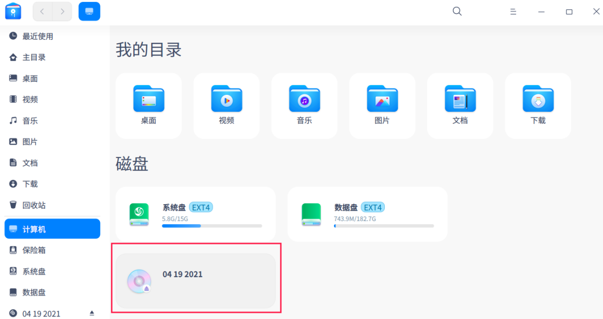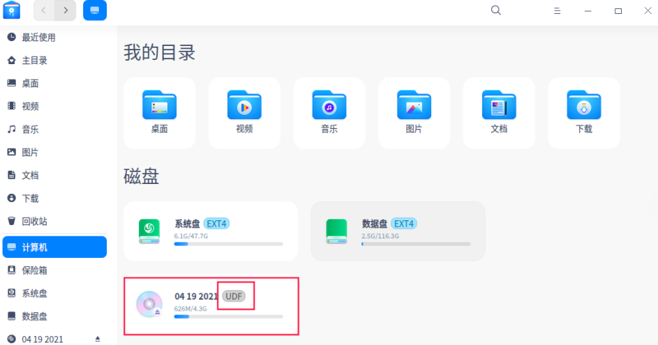 3、双击光驱图标后文管自动挂载UDF格式光盘的状态:(自动挂载后会有光盘格式显示,例如UDF,ISO9660等)