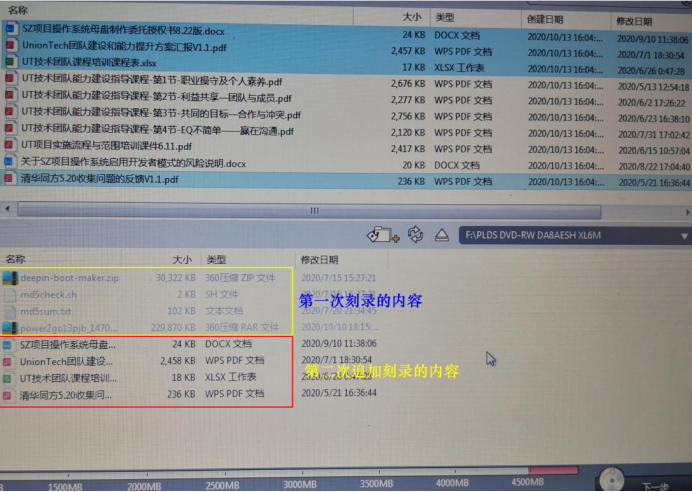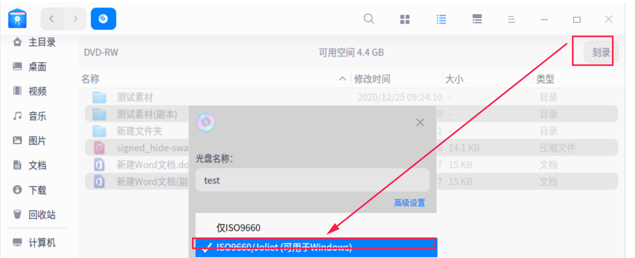 将刻录完成的光盘放到统信桌面操作系统,光盘盘符显示格式为 ISO 9660,内容正常,显示正常。重新将光盘放回 win7,并追加刻录新的内容: