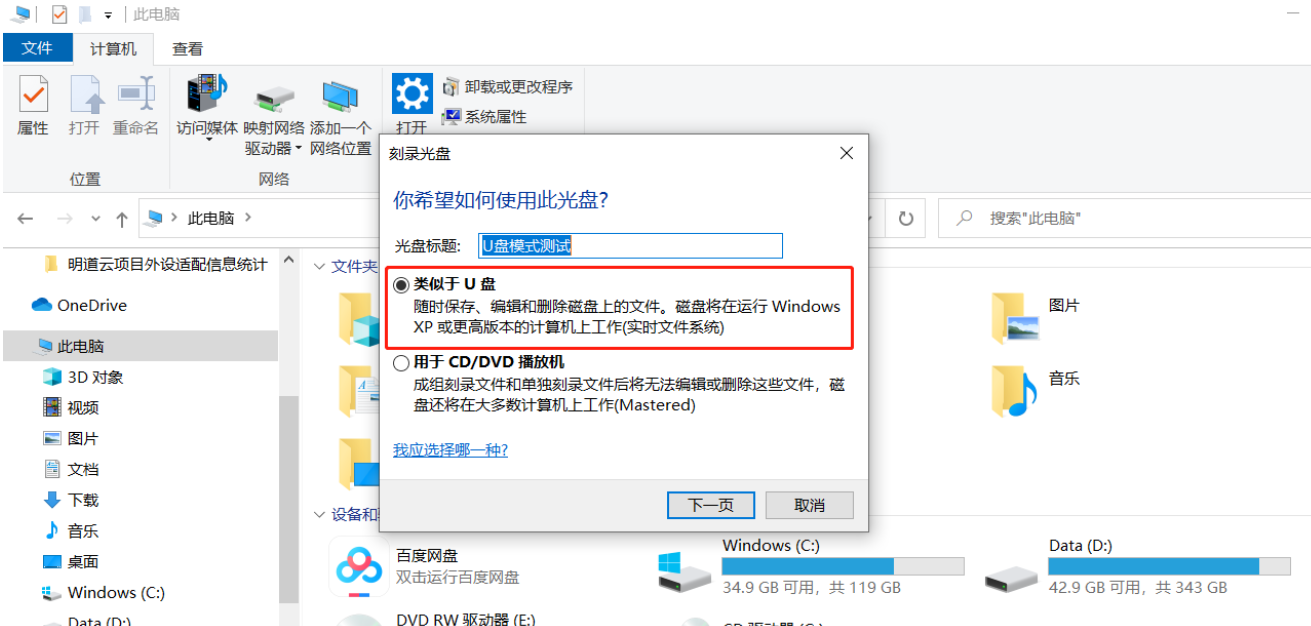 6、Win10系统中直接刻录时选择“类似于U盘”模式将自动采用UDF2.01版本进行刻录,此情况下在UOS系统1040环境中可识别查看复制文件,但是并不支持追加刻录。