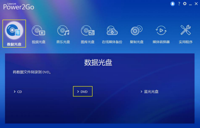 百度上下载Power2Go.exe,安装完成后,软件启动界面如下图,一般选择数据光盘——DVD,根据实际情况按照提示进行顺序操作
