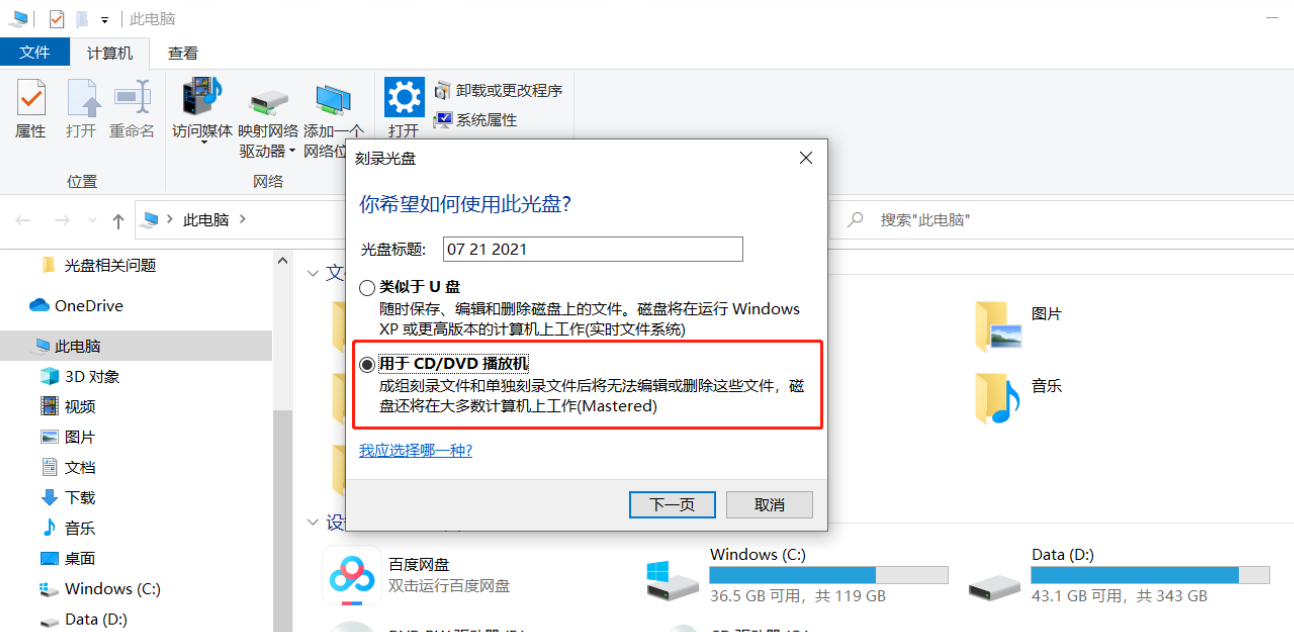5、Win10系统中直接刻录时选择“用于CD/DVD播放机”模式时会自动采用UDF1.02版本进行刻录,此情况下在UOS系统1040环境中是可以识别并进行追加刻录的。