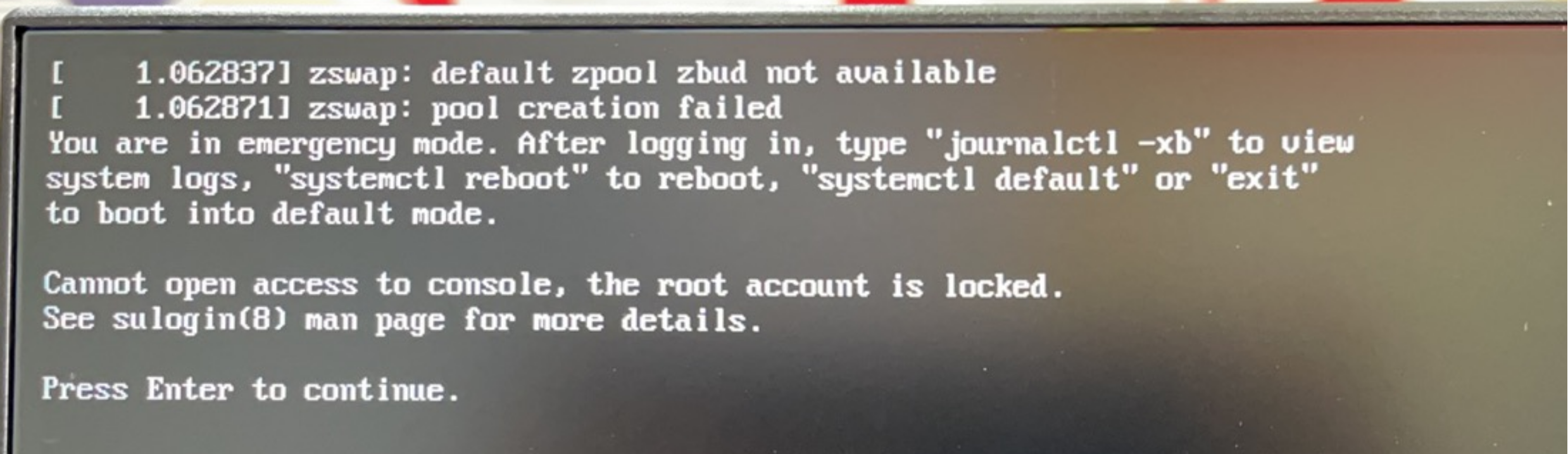 ****1、问题描述:电脑开机之后进入emergency mode,提示Cannot open access to console. The root account is locked,按回车也无法进系统,重启电脑也无效如下图:****