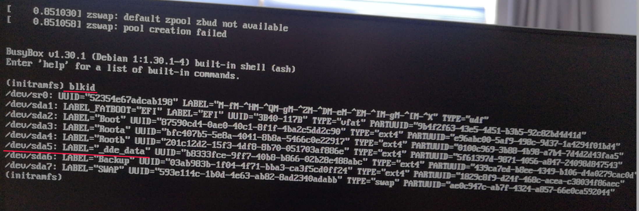 3)执行**blkid**命令,查看分区情况,找到“**_dde_data**”对应的分区,即/dev/sda5(根据实际情况来定),如下图: