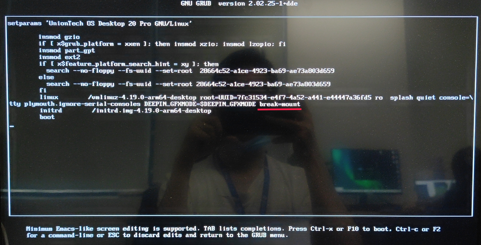 2)在Linux开头的那一行末尾添加参数**break=mount**,如下: