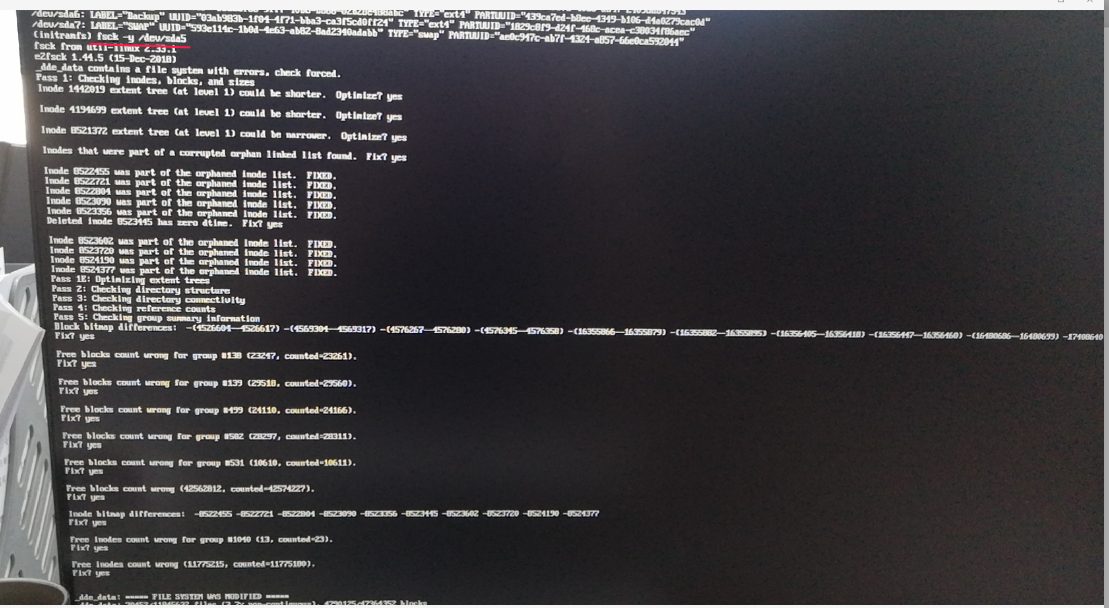 4)执行命令**fsck -y /dev/sda5**修复(根据自己电脑实际显示的硬盘名称修改盘符名称),如下:
