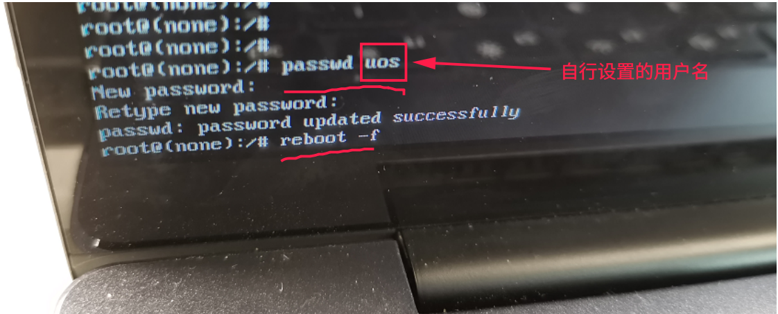 4、输入 **passwd username** 修改用户密码, username 为要修改的用户名称(如用户名是uos,则输入 passwd uos),然后输入 reboot -