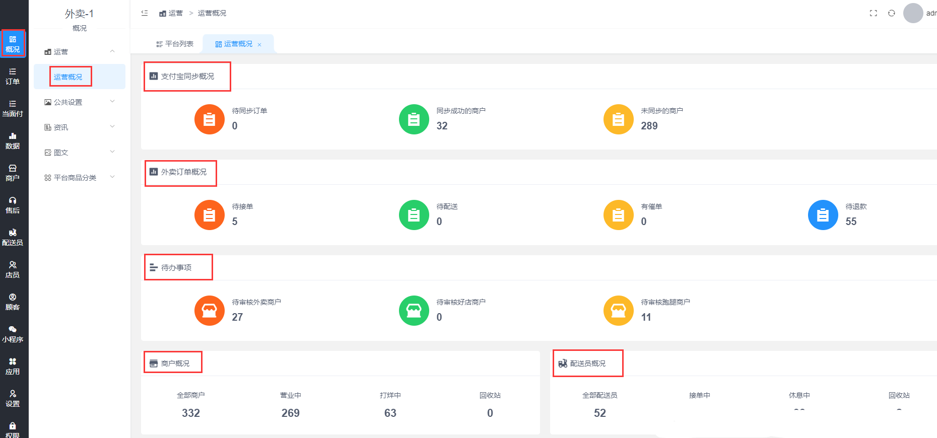 ## **可以看到外卖订单概况、商户配送员概况、支付宝同步概况和待办事**