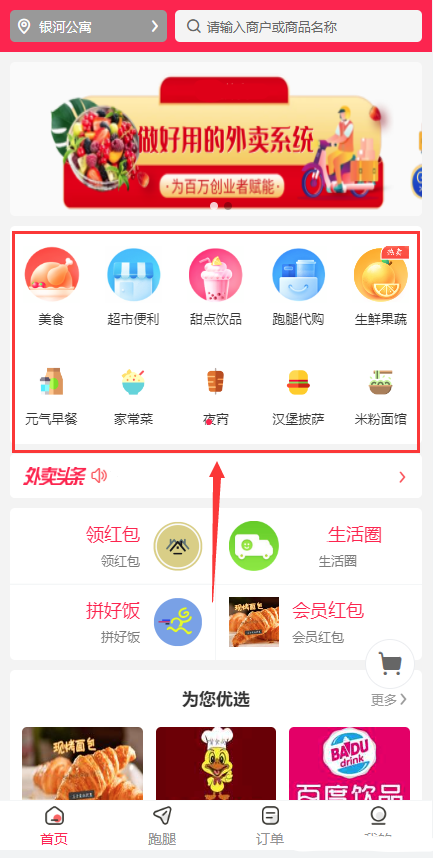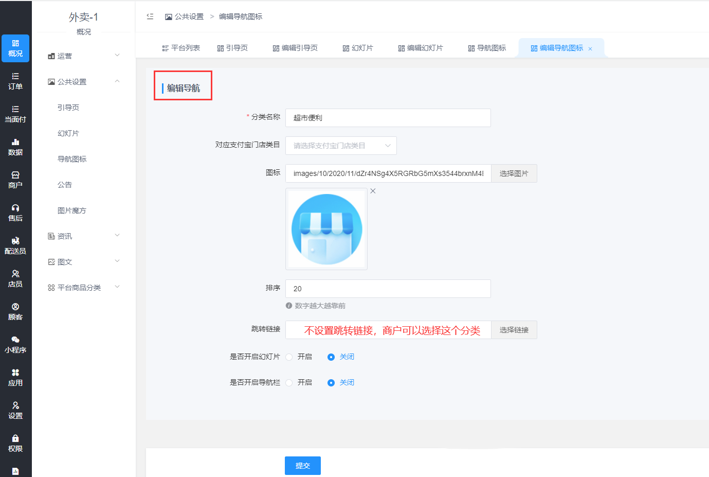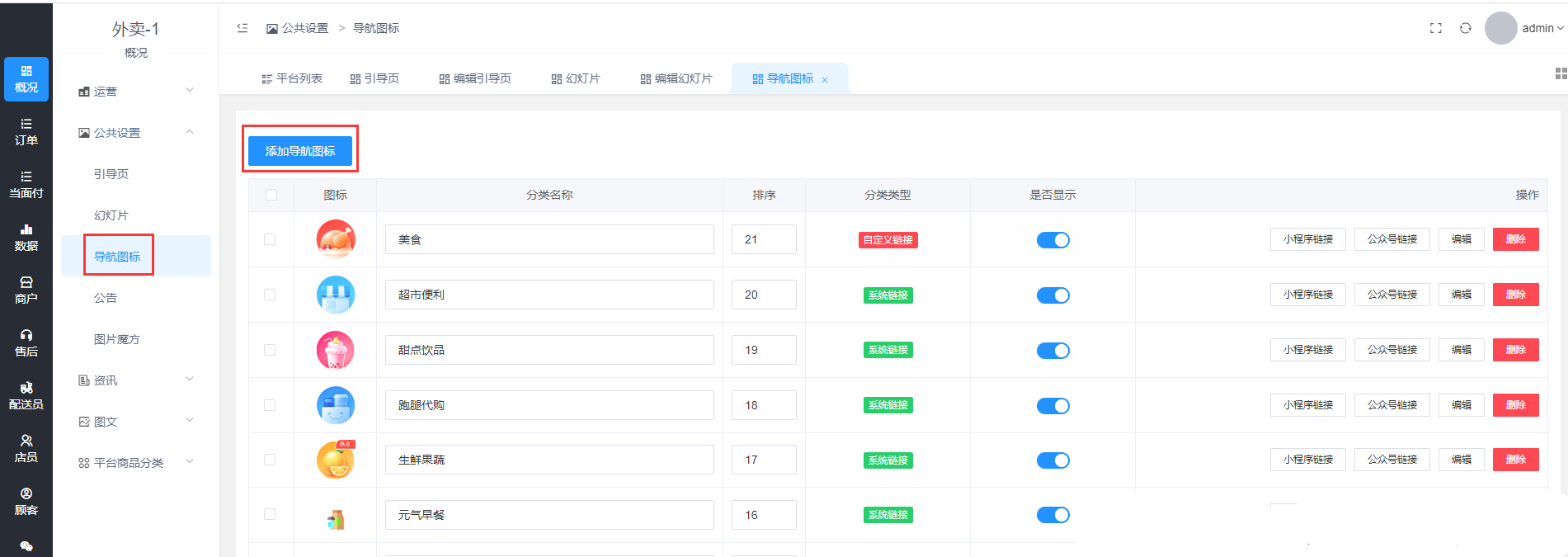 **首页导航图标,即商户分类,相当于平台装修自定义页面里的导航栏组件**
