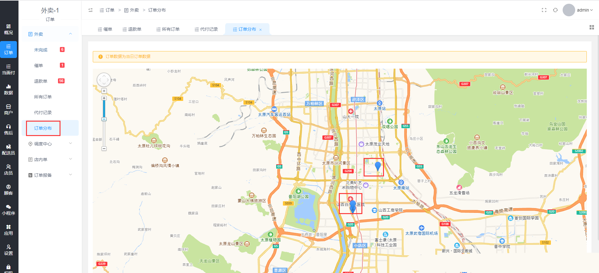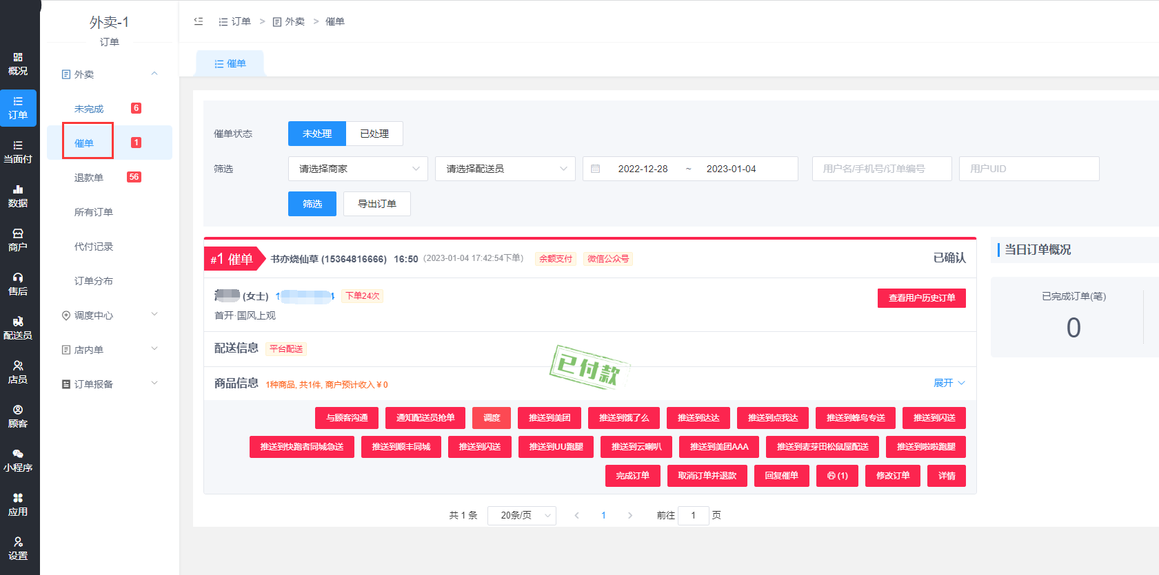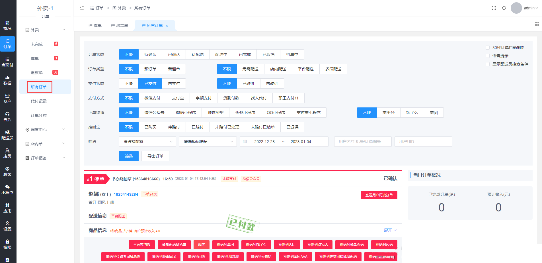 ## 可以查看外卖订单的未完成订单、催单、退款单、所有订单、代付记录和订单分布,对订单进行一系列操作。