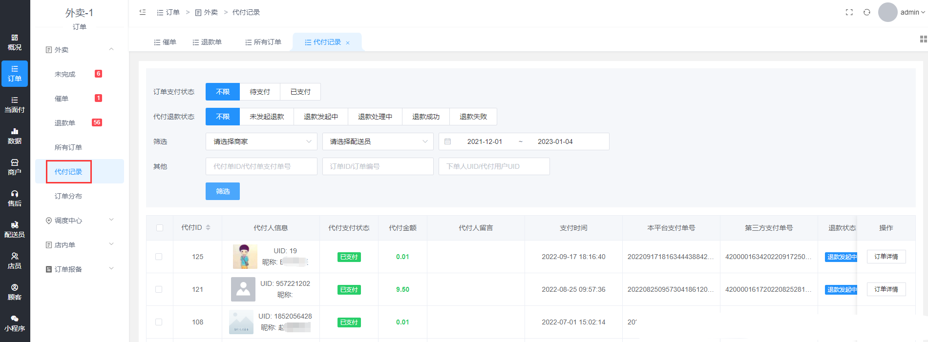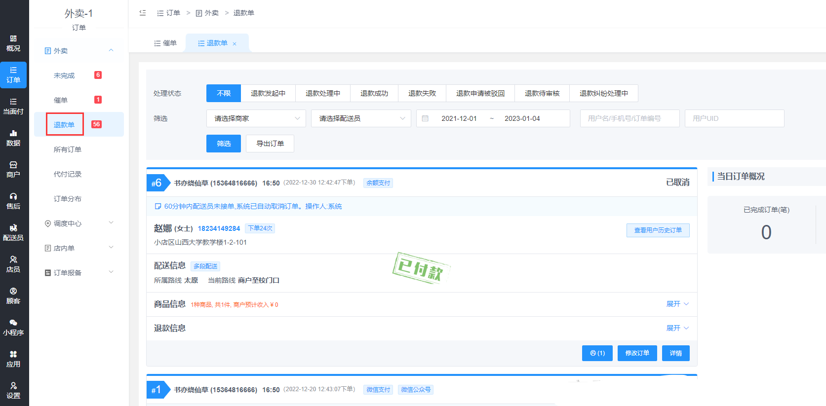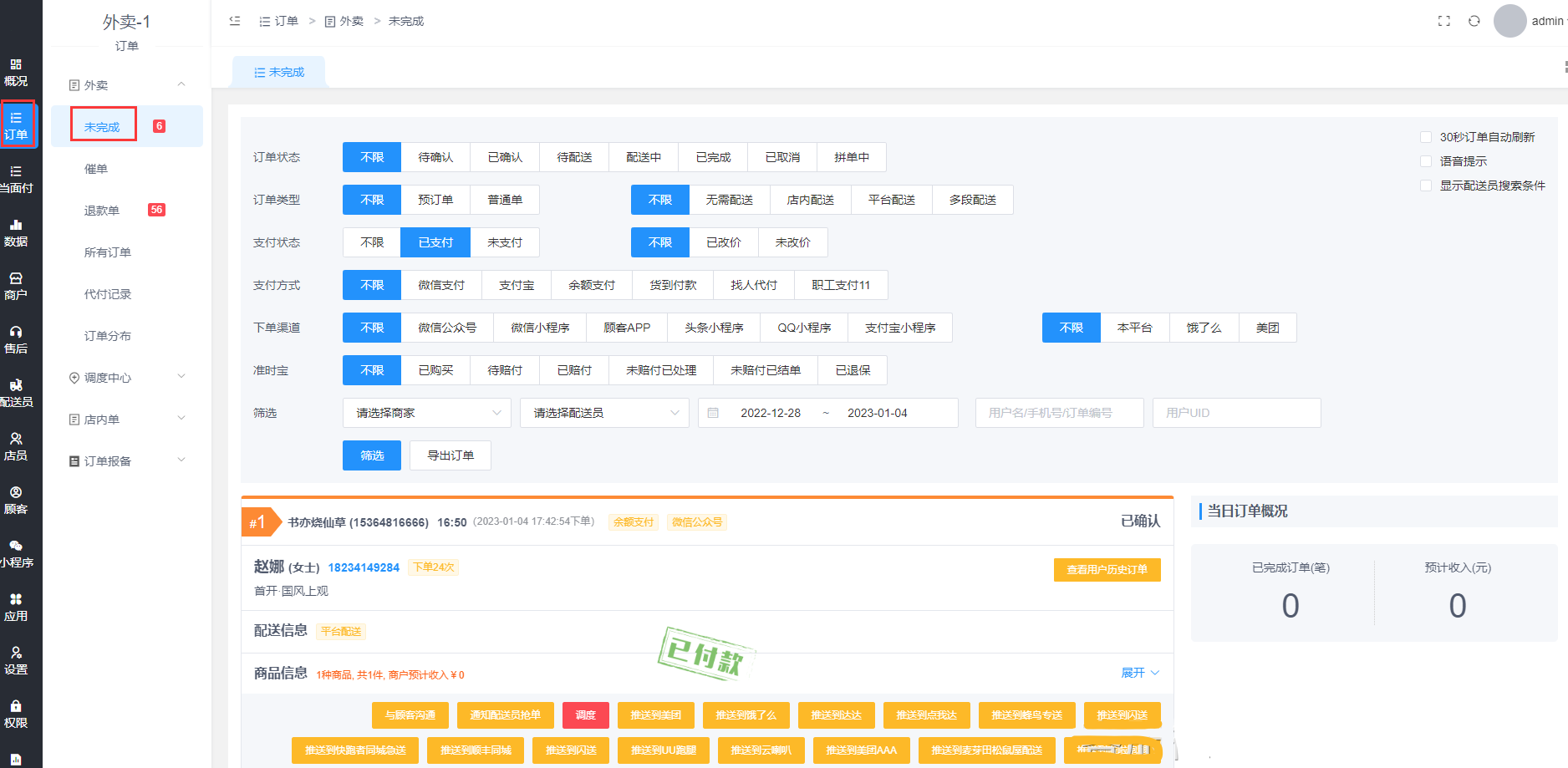 ## 可以查看外卖订单的未完成订单、催单、退款单、所有订单、代付记录和订单分布,对订单进行一系列操作。