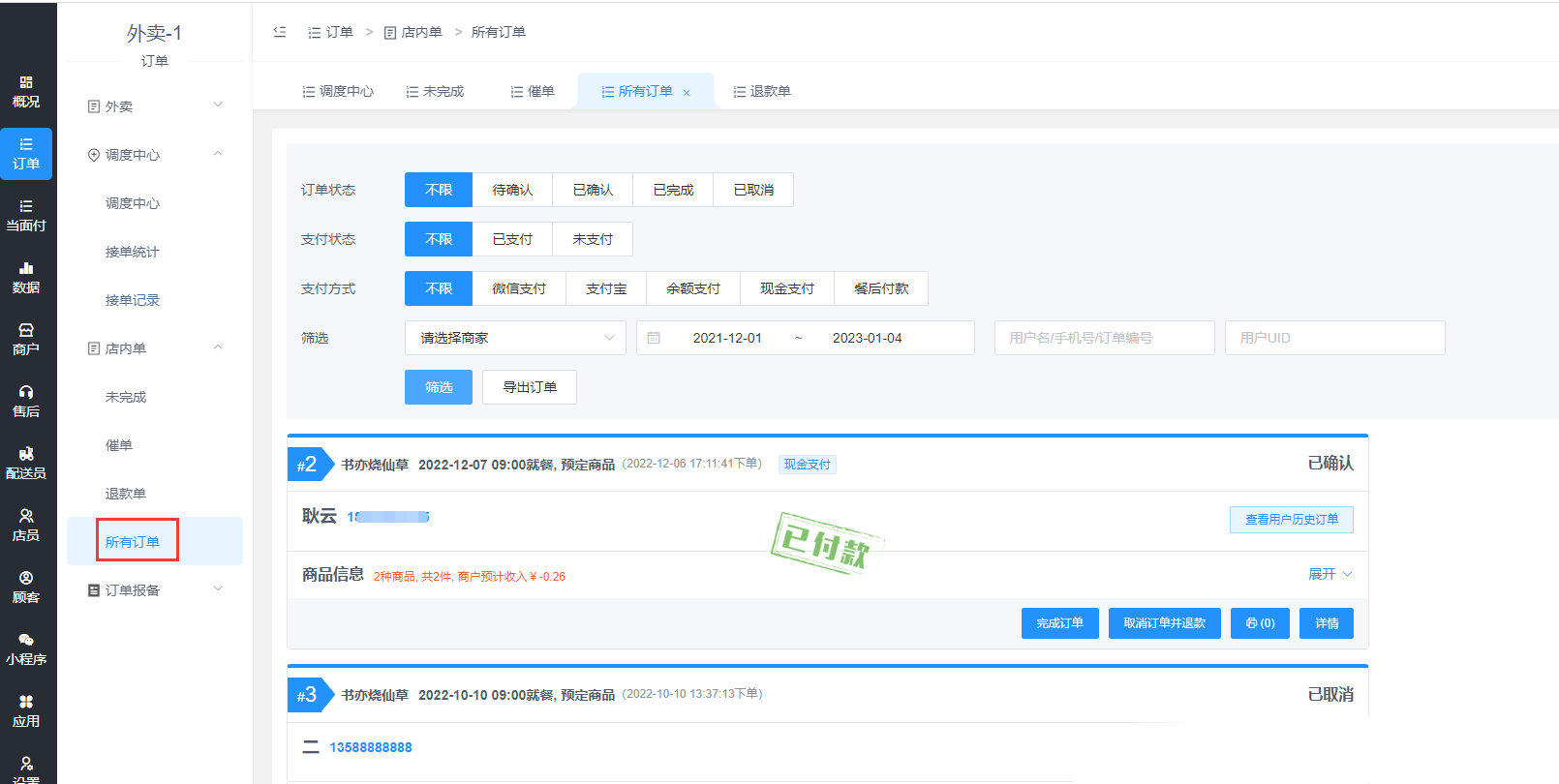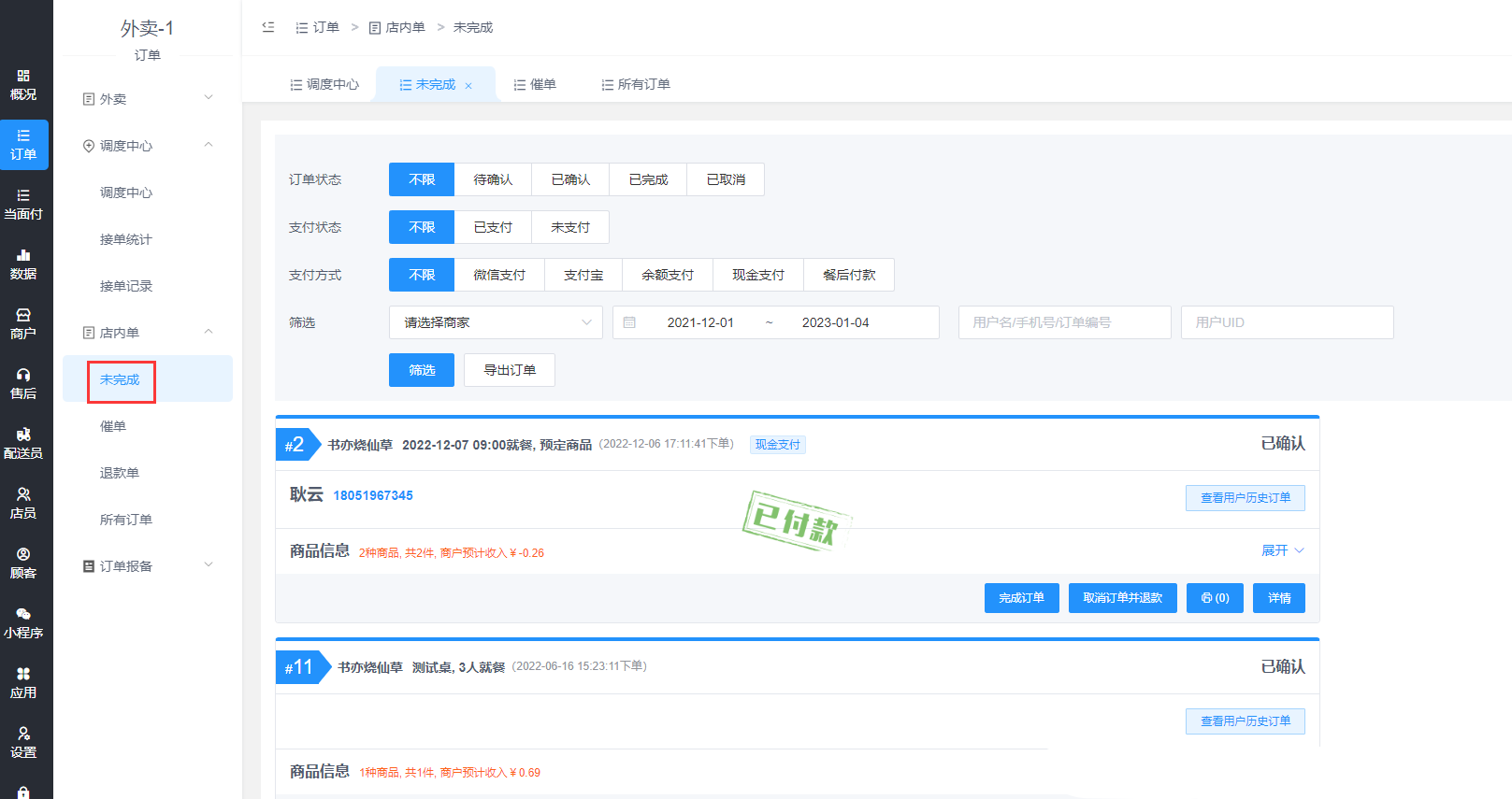 ## **店内桌台扫码点餐的订单,可以查看未完成、催单、退款单和所有订单,对订单进行操作。**