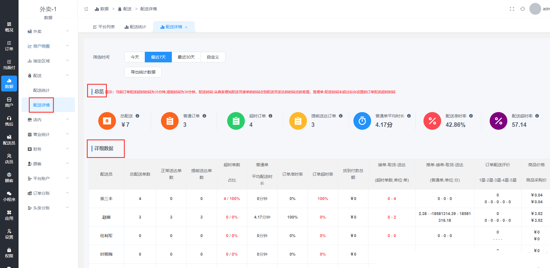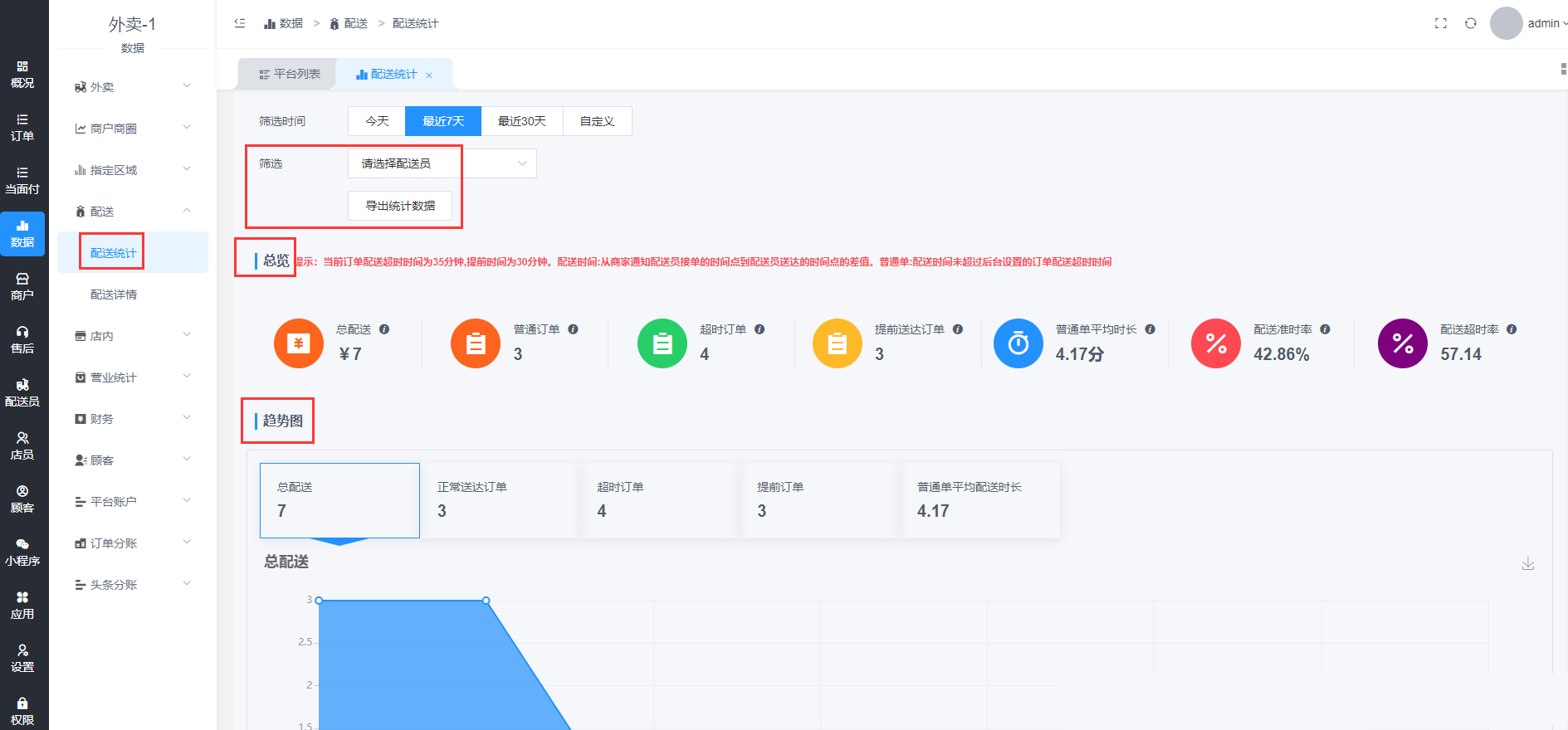 **可以筛选查看配送员的配送统计,可以导出统计数据**
