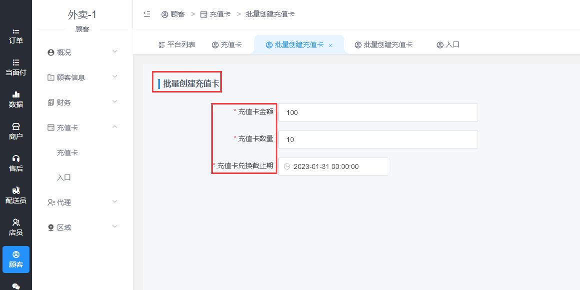 **可以批量创建充值卡,发放给顾客,顾客兑换充值。可以导出充值卡数据**