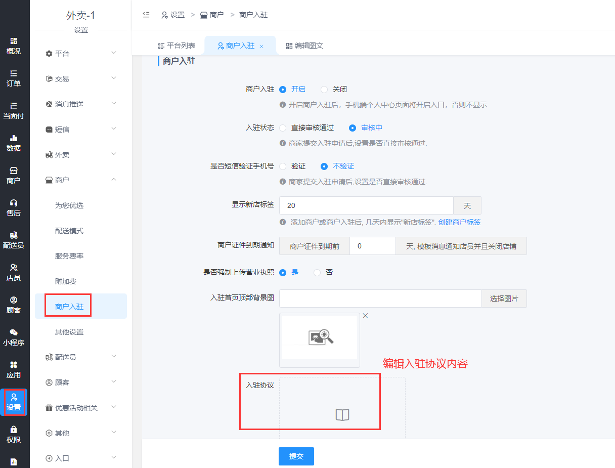 **在总平台后台设置-商户入驻,修改下入驻协议,并提交,如下图:**