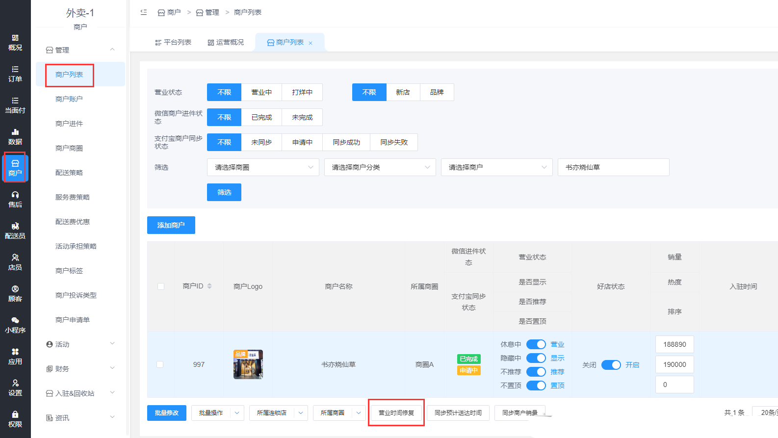 >[danger] 注意:商户的营业时间是有两个地方控制:商户-商户列表-营业状态;商户后台设置营业时间,营业时间有两分钟的缓存。