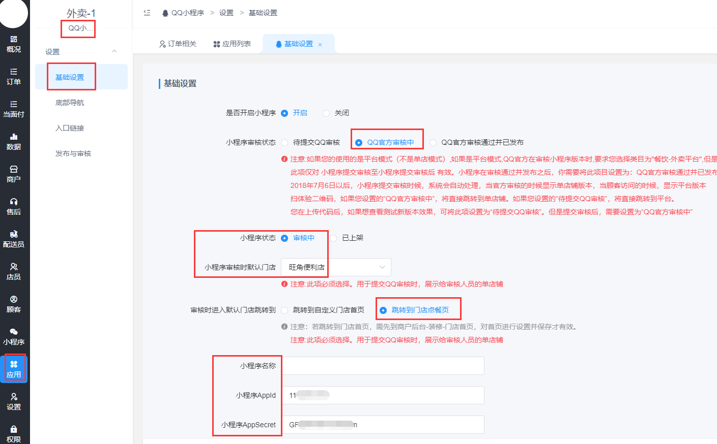 **进入后台应用-QQ小程序-基础设置,设置官方审核中,选择审核时门店(没有资质的话,可以使用文具店去提交),设置小程序名称、appid/appsecret**