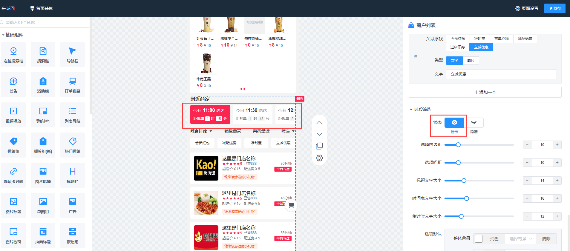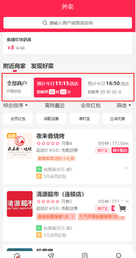 >[info] **功能:平台可创建固定的配送时间段,顾客在首页选择配送时间段,会对应显示出该时段可以送达的商户列表,然后选择商户下单,适合校园集中场景。**